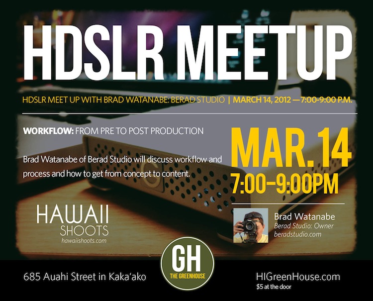 Come learn a little about Hawaii video production and bring your DSLR out to The Green House for our second HDSLR meet-up of 2012.